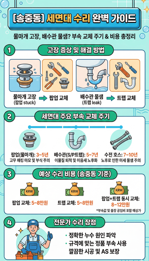 바쁜 아침, 세수를 하려고 물을 틀었는데 세면대 물마개(폽업)가 눌린 채로 올라오지 않거나, 세면대 아래 다리 사이로 물이 뚝뚝 떨어져 발이 젖는다면 정말 난감하시죠? 송중동의 빌라나 오래된 아파트에서는 세면대 부속의 노후로 인해 이런 문제가 자주 발생합니다.